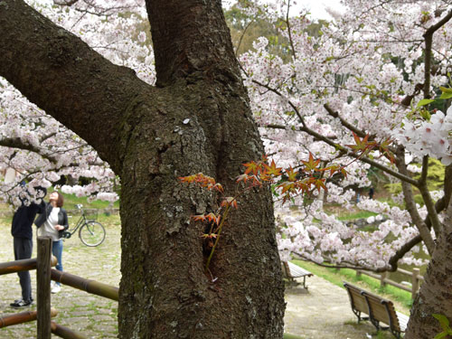 桜堀の入口付近、桜の幹のくぼみからモミジが生育している珍しい様子を見ることができます。