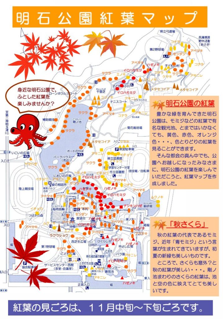 兵庫県立 明石公園(読み方:ひょうごけんりつ あかしこうえん)は、兵庫県の明石城跡を明治16(1883)年5月、当時の明石郡内の有志による民営公園として開園されました。その後、明治31(1898年)年10月には、皇室の御料地に編入されるなどの経過をたどり、大正7(1918)年4月、新たに県立公園として開園しました。公園で、広大な敷地に美しい自然や歴史的な建物が点在しています。公園内には庭園、遊具、ピクニックエリアなどがあり、家族連れや観光客に人気があります。また、四季折々の花々や緑に囲まれた景観が楽しめるため、特に春には桜の名所として知られています。11月中旬には紅葉も見ごろを迎えます。公園の中心には明石城の遺構があり、これを背景にした散策や写真撮影も多くの人に親しまれています。さらに、明石公園内では地域のイベントや祭りが開催されることもあり、地元文化を体験する場ともなっています。