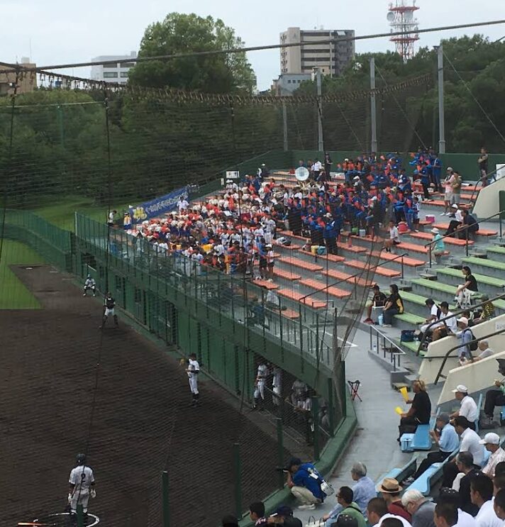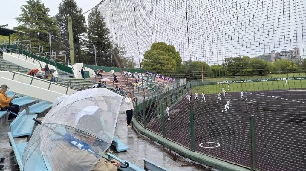 内野席は屋根が無いベンチ自由席、外野は木々のしげる芝生席。