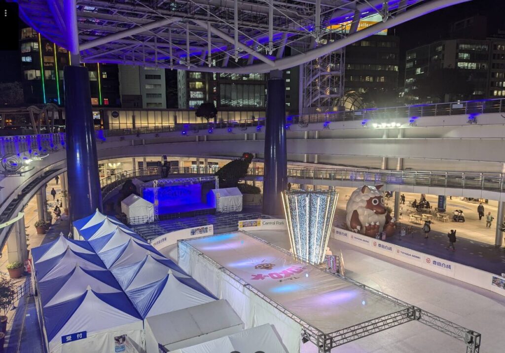 氷と違って、季節、場所を問いませんので、真冬以外の期間も、また、商業施設の真ん中という立地条件でもリンクを作ることができます。また、摩擦が氷より大きい分、ツルツルと滑ることがありません。お子様や、シニアの方、初心者の方も比較的簡単に立つことができ、安心して楽しむことができます。製氷のための大量な水や電気を使わないので環境にもやさしいリンクです。吹き抜け天井はくもりガラスで明るく、雨天でも楽しめます。お買い物ついでにも寄れますし、イベントやスケート教室も定期開催されているようです。平日でも子供たちを中心に人気があるようで賑わっています。平日は平日割引もあるようなのでぜひご利用されてはどうでしょうか!その他、学生割引、夜間割引、レディースデイ割引、レシート割引などあるようです。営業時間は20時ですが受付は19時30分のようですのでご注意を。