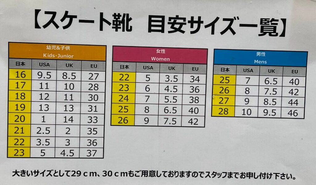 ※ スケート靴の持ち込みはできません。ご用意している靴のサイズは16cm~30cmです。(1cmずつサイズの違う靴をご用意しています。靴の数には限りがあります。)