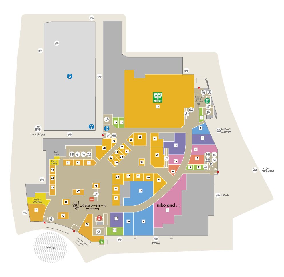 こもれびフードホール 1階には一大フードゾーン「こもれびフードホール」が誕生します。公園に隣接し、包み込むような森をイメージした天井が高い大空間に、約1,000席の客席とその客席を囲むように22の店舗が配置されています。新業態、埼玉県初、所沢市内初をはじめ、地元フード、和洋中、アジアンフード、デザートなど人気の店舗が軒を連ねます。また、靴を脱いで寛げる「こあがり席」や予約制の「パーティールーム」、テイクアウトメニューも充実し、朝から夜までさまざまなご利用シーンにあわせてご利用いただけます。小さなお子さま連れのお客さまが利用しやすいようにこども専用テーブルや椅子をご用意したキッズスペースの設置や、USBポートやコンセントを設置している席もご用意し、PCや携帯電話の充電なども行うことができます。また、本来廃棄される建築資材をアップサイクルしテーブルや椅子に生まれ変わらせ、環境への配慮も行っています。