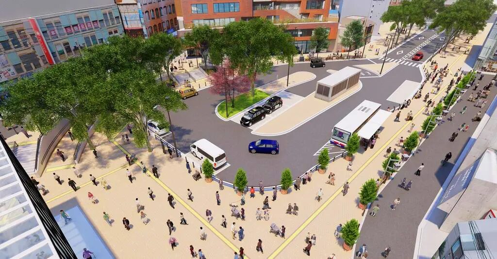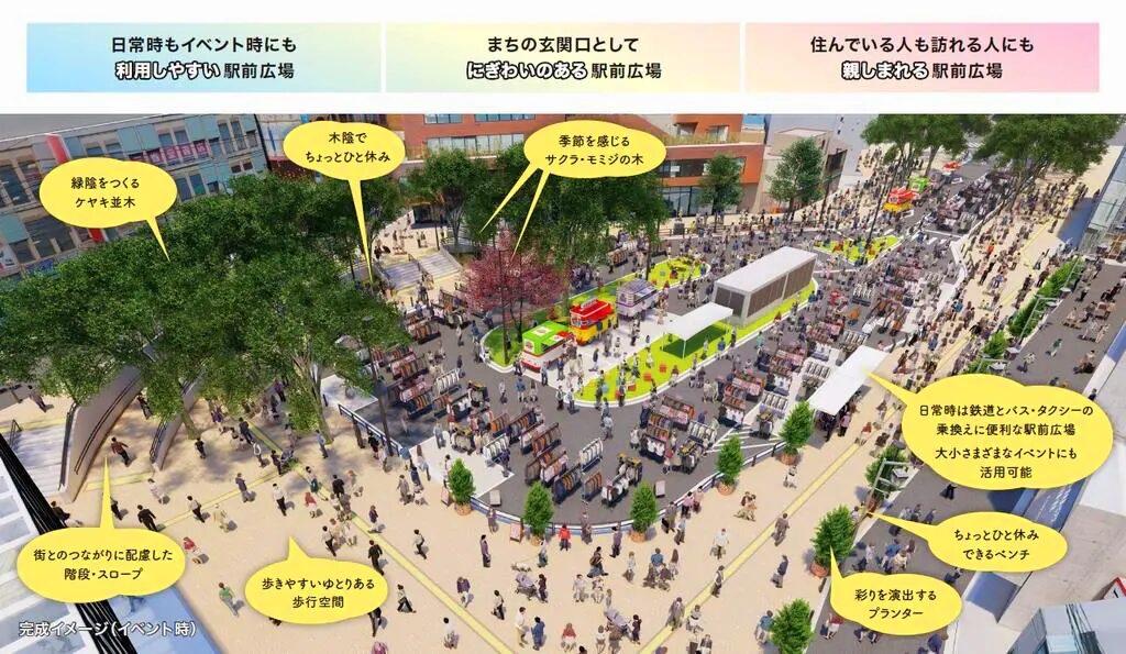 この「駅前ロータリー計画」は、街の課題だった鉄道・バス・タクシーの交通結節機能の強化やバリヤフリー化による利便性の向上、体の不自由な人が駅前まで車で来れるような街づくりをを踏まえて進められてきたものだそう。