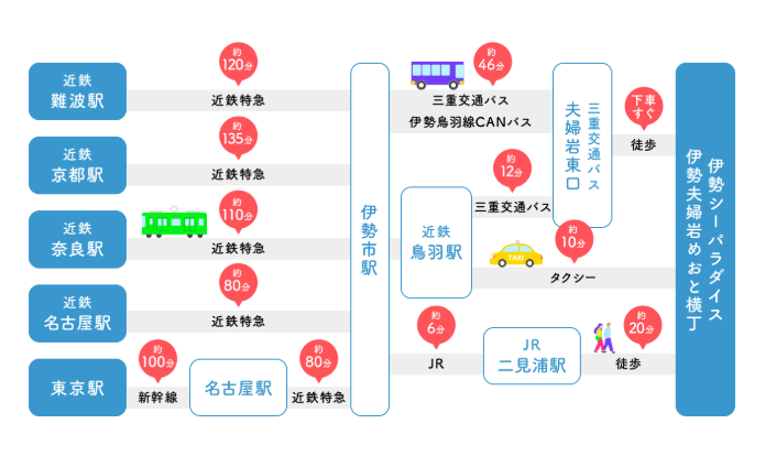 伊勢シーパラダイス・伊勢夫婦岩めおと横丁、夫婦岩へお越しの際は施設西側にある駐車場をご利用ください。