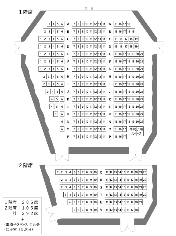 392席(1階席:286席/2階席:106席)+車いす席2席