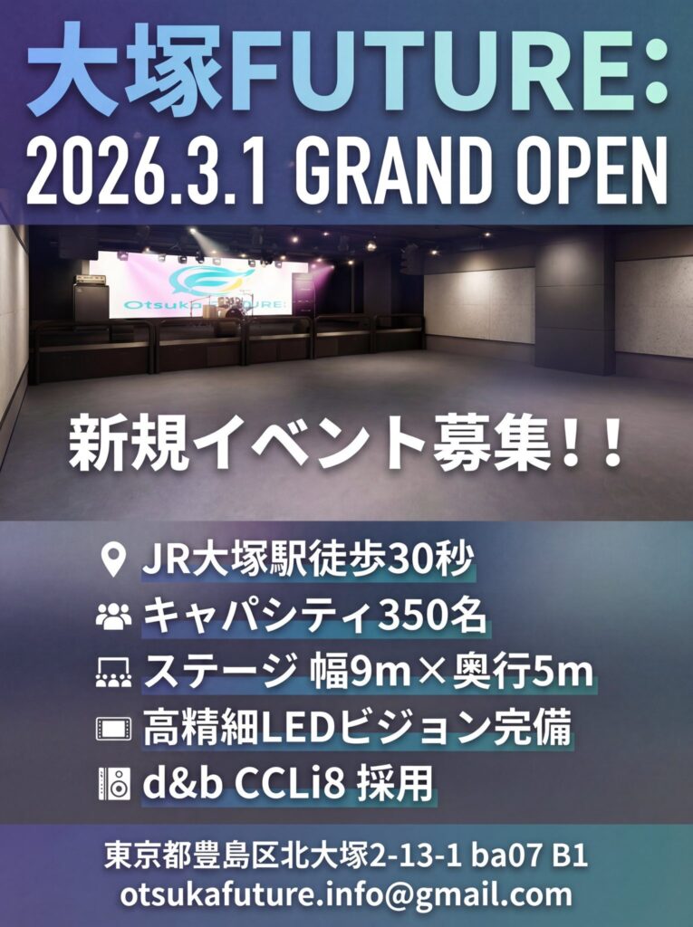 大塚FUTURE:(読み方:おおつか ふゅーちゃー)は、東京都の大塚駅前ビルの地下1階に2026.3.1完成のライブハウスです。大塚FUTUREの後に「:(コロン)」が付きます。Xツイッターでライブハウスができるまでを写真付きでポストしていました。渋谷RINGと中野坂上S.U.B TOKYOに続く3店舗目の経営だそうです。