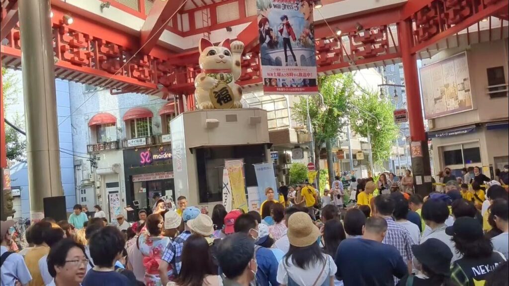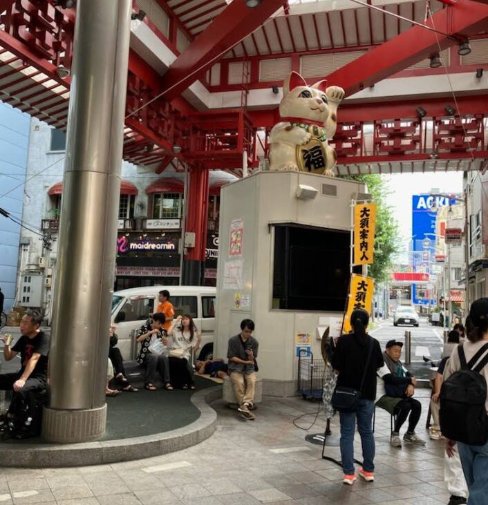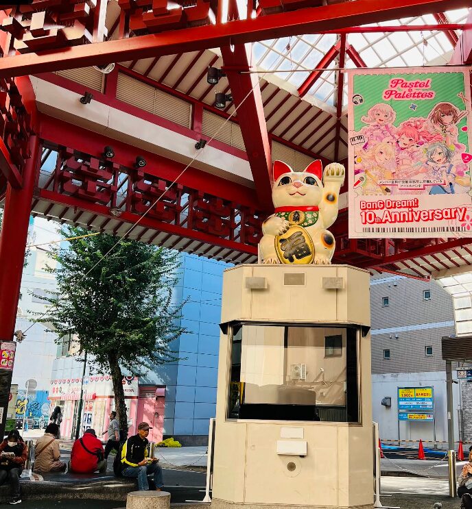 実際に足を運んでみると、想像以上に活気があって、日本らしい賑やかさと多国籍な雰囲気が混ざり合う独特の空間で、とても印象に残りました。大きな白い招き猫が広場のシンボルとして鎮座していて、そこに来るだけで「大須に来た!」という気分になります。待ち合わせ場所にもぴったりで、初めて来ても迷わずたどり着けました。 商店街全体はアーケードになっているので、雨の日でも安心して歩けるのが嬉しいポイント。私が行った日は平日でしたが、それでも人通りが多く、休日にはもっと混み合うんだろうなと思いました。広場の周りには椅子もあって、食べ歩きの途中でちょっと腰掛けるのに便利。名古屋名物のスガキヤも近くにあって、観光に来た人たちが一息ついている姿が印象的でした。 そして、この場所はただの休憩スポットにとどまらず、さまざまなイベントや大道芸が開催される場所でもあるそうです。実際、私が訪れたときもストリートパフォーマンスに人だかりができていて、まるで小さなお祭りのような雰囲気でした。節分や夏祭りのシーズンには花魁道中や露店が並んでさらに華やぐとのことで、そうした時期に再訪したいなと思いました。 面白いのは、この広場がとても国際的な空気をまとっていることです。商店街には和菓子屋や唐揚げのお店だけでなく、ケバブ、ベトナム料理、インドカレー、ベルギー料理など、世界各国の味が集まっていて、食べ歩きが本当に楽しい。観光客だけでなく地元の人たちも気軽にビールを片手に唐揚げを頬張っていて、誰もがリラックスして過ごしている感じが心地よかったです。外国からの観光客も多く、英語や中国語、韓国語があちこちから聞こえてきて、東京の下町や原宿とも違う独特の国際色を感じました。 少し驚いたのは、昔は喫煙所として利用する人も多かったそうですが、最近はルールが変わっていて、座って休む人や待ち合わせに使う人の方が目立ちました。中には「ここに来るとなんとなく安心する」という声もあり、地元の人たちにとってのランドマーク的な存在であることを実感しました。 夜に来て飲み歩きを楽しむ人もいれば、アイドルのライブや芸能人の撮影に出くわすこともあるそうで、ただの商店街の広場以上のエンターテイメント性を持っているのも魅力だと思います。まさに「名古屋の巣鴨」「名古屋の裏原宿」といった表現がぴったりで、老若男女、そして国籍を問わず誰もが楽しめる場所でした。 今回の旅では昼間に散策しただけでしたが、次はぜひ夜に訪れて、ネオンに照らされた招き猫や、屋台での食べ歩きを満喫してみたいです。東京から名古屋までは新幹線ですぐに来られる距離なので、気軽に足を運べるのも魅力のひとつ。日本に移住してからいろんな街を巡ってきましたが、大須商店街の招き猫広場は特に印象的な体験のひとつになりました。観光で訪れる人はもちろん、地元の人の暮らしに触れたいと思う外国人にとっても最高のスポットだと思います。
