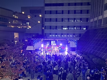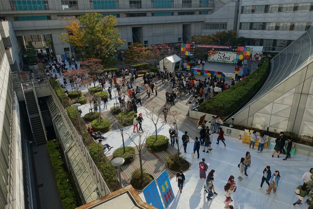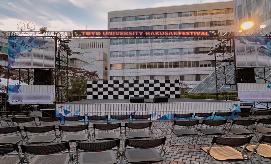 屋外でステージ観覧席ともに屋根が無いため、雨天は4号館地下2階 練習館で行われる場合もあります。