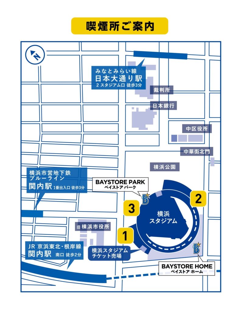 ・紙巻きたばこの喫煙は「横浜スタジアム・日本庭園間並木通り(BAY SIDE ENTRANCEスロープ横付近)」1カ所のみとなります
