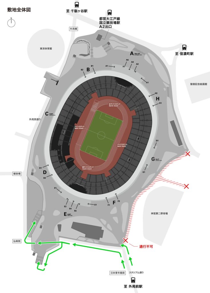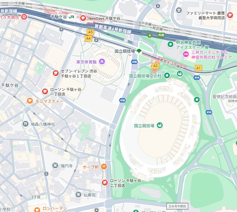 正式な所在地は新宿区霞ヶ丘町だが、競技場の敷地の一部は渋谷区にまたがっています。明治神宮外苑に隣接するが、神宮外苑の施設には含まれていません。