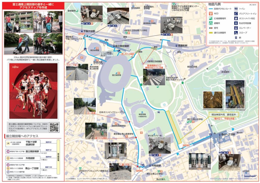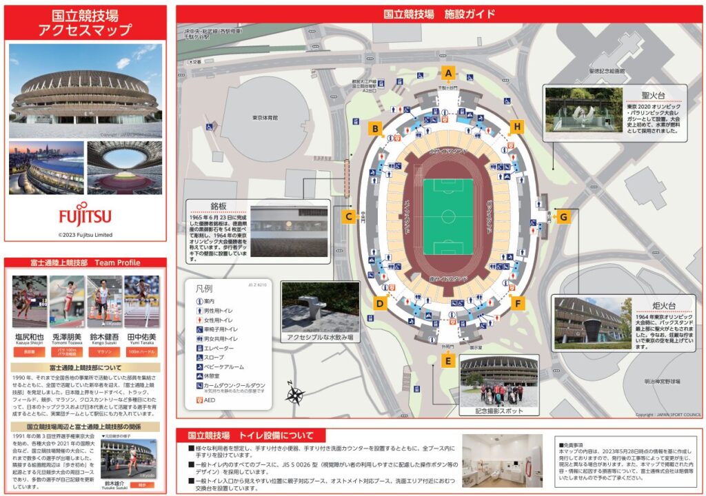 国立競技場の周辺にトイレ、水飲み場、ベンチがあります。