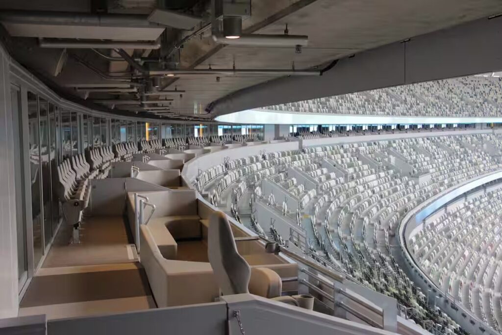 約350m×約260mの地上5階・地下2階のスタンドがフィールドを囲む。スタンドは3層式で、1階が最下層の上端、2階が中間層の中段、3階が中間層の上端、4階が最上層の中段となっている。約6万席の観客席は全てカップホルダー付きの個別席で、木漏れ日をイメージした5色の『アースカラー』をモザイク状に配置しています(上層に淡色を多く、下層に濃色を多く配色)。この配色は遠方から見た際に空席を目立たせない効果もあります。