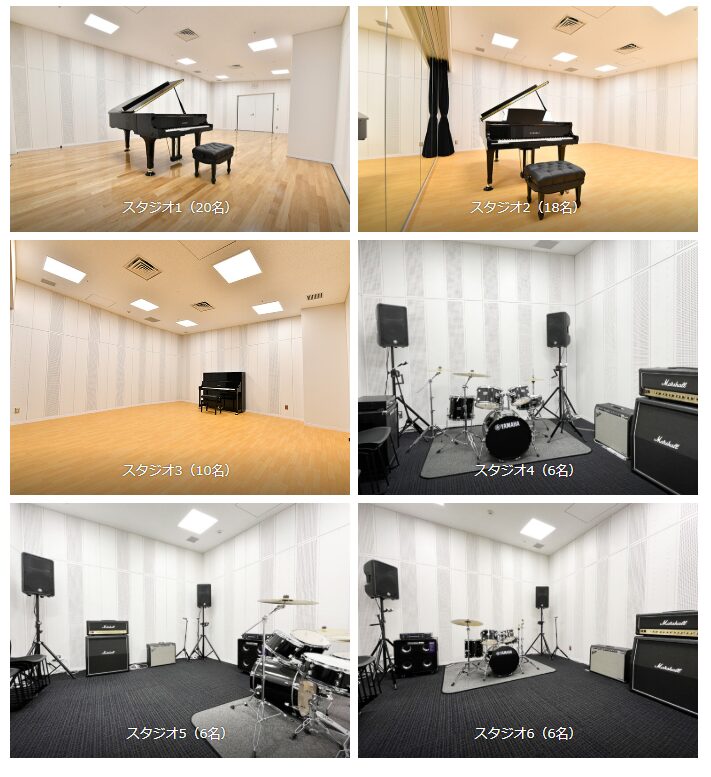 音楽の演奏・練習に利用ができます。スタジオ1~3にはピアノ(有料)が設置してあり、合唱や吹奏楽で利用ができます。