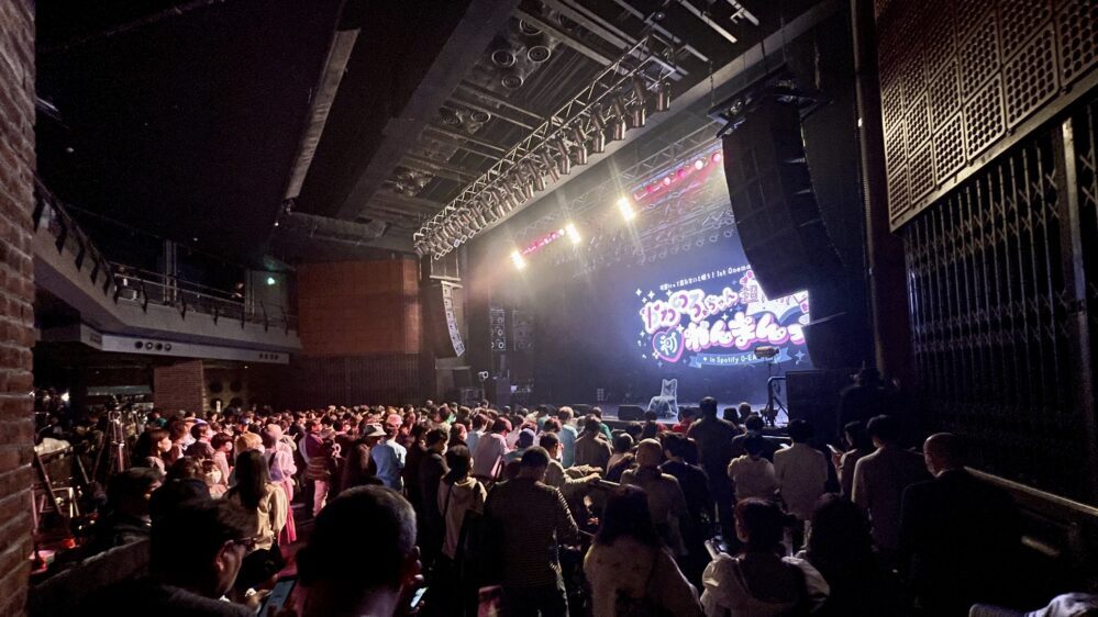 見やすい場所は、もちろん最前列なのですが、整理番号が早ければワンチャンありますが、ほとんど取れません。となると、ステージが割と高いので男性なら前方になりますが、背の低い女性ですと下階(2階)の後方にある1段差の最前が狙い目となります。上階(3階席)が解放されていれば、あえて上から見るというのが、普段見れない角度で見れてオッススメです。