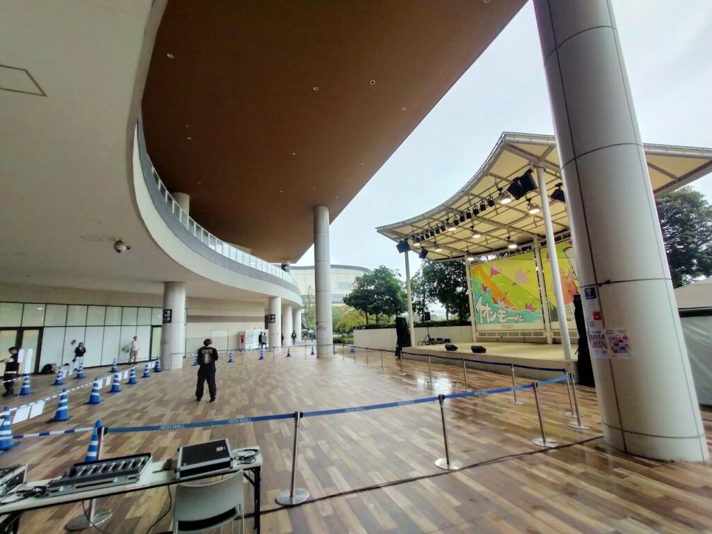 背景には公園の緑が見えて気持ちの良い屋外イベントスペースです。雨が降ると前5列目ぐらいまでは濡れますので、前方で見るならレインコートが必要です。1階カミテ側などをお子様&女性エリアにスロープで仕切ったり自由自在にできます。観覧エリアロープ内は飲酒禁止で飲食もなるべく公園やベンチですませましょう。物販は晴天なら豊砂公園も使われたりし、雨天や通常は左右の軒下になります。2階部分からはダンスフォーメーションや舞台袖など、普段見れない角度で楽しめます。転落防止ガラスが汚れているのでクリーンには見えません。また2階にもベンチがあり、ライブハウスでは重低音にかき消されてしまいがちな高音の歌声が心地よく響きわたります。建物入ってすぐ右にトイレと喫煙所、更に進むと食料品売り場があります。開場前のトイレはシモテに多目的トイレと豊砂公園に公衆便所があります。