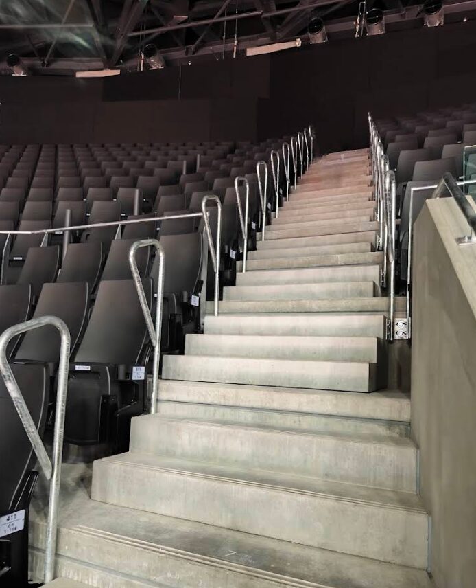 ステージは高くて、1階席は平坦、2階から上の固定席はかなりの急こう配で、前の人の頭がなるべくかぶらないように設計されています。