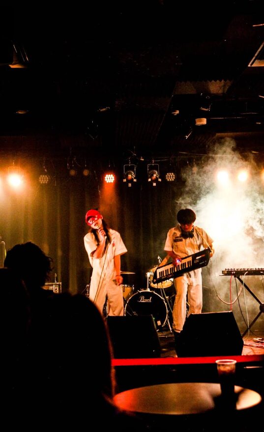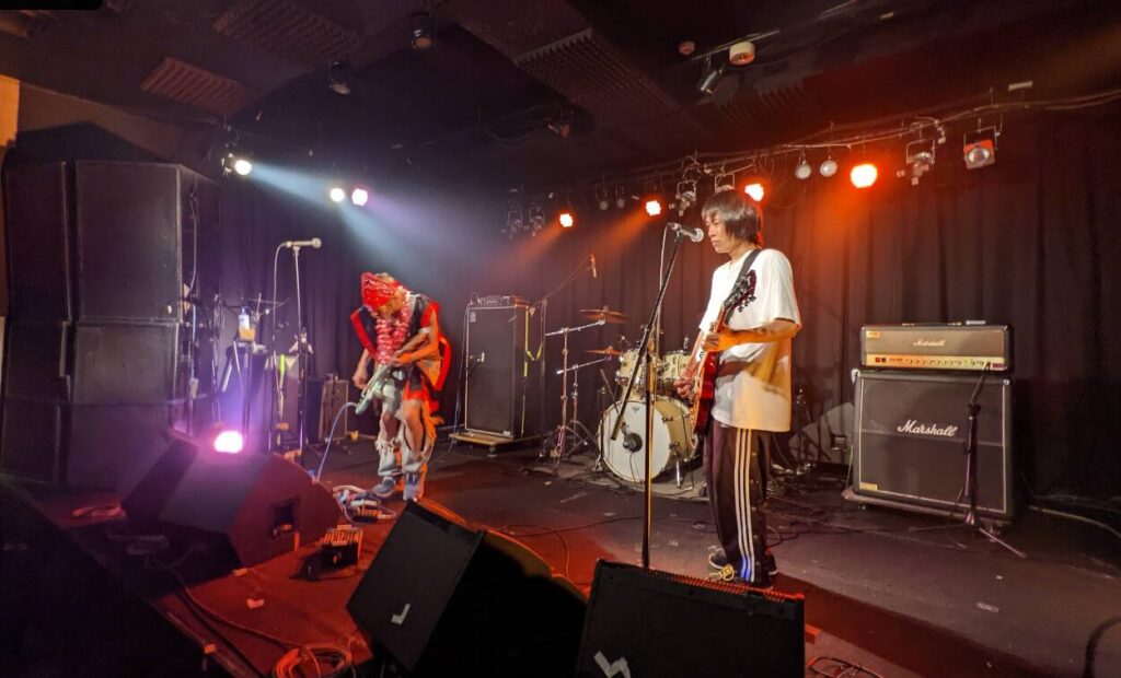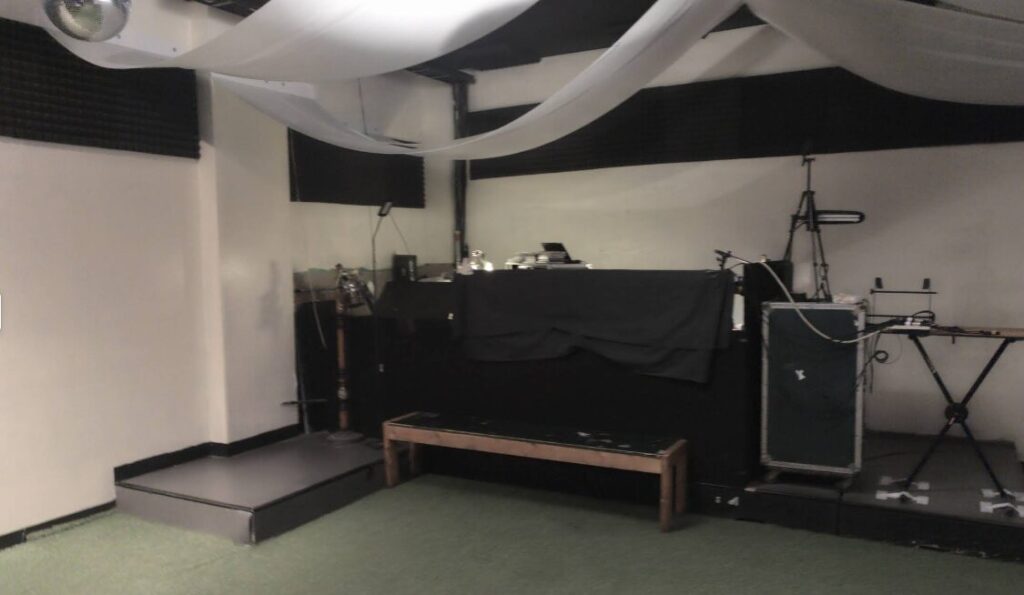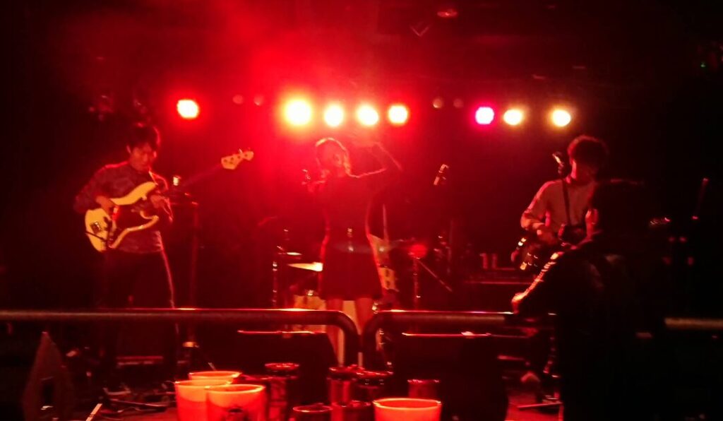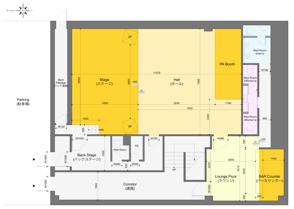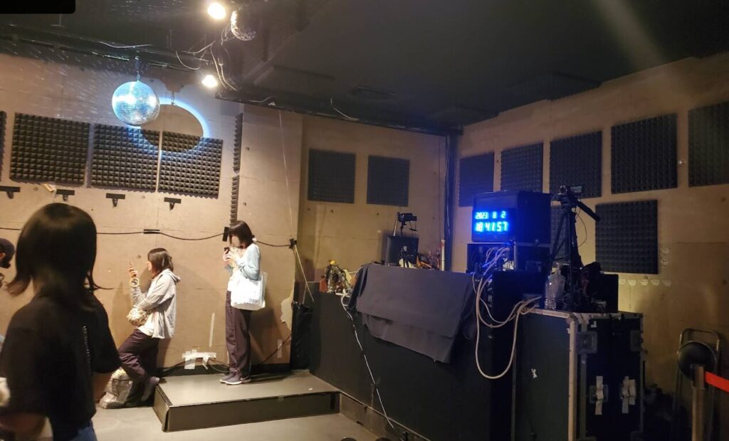 ステージ高さは75cmぐらい ステージ前端とフロアの間隔なし 直径7cmぐらいの鉄パイプが最前柵 演者は下手から登壇します。