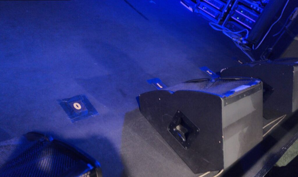 最前列3-1-3 スピーカー見切れ位置で両側に+1ぐらい 。バミは3までで3バミのすぐ横にスピーカーが来る感じです。フロアはフラットなので後ろは見にくいかも。