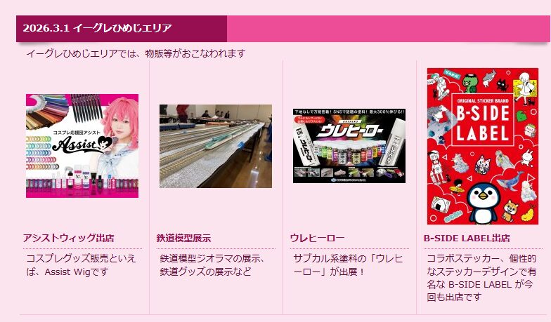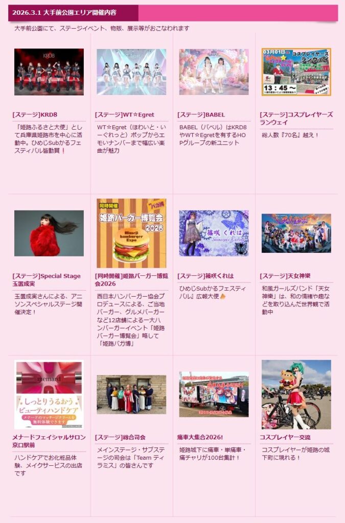 この公園で開催されるひめじSubかる☆フェスティバル2026は、大手前公園ならびに、イーグレひめじ周辺で行われるコスプレイヤー、ご当地アイドルステージ、痛車、プラモデル、模型展示、鉄道模型、ミニ四駆 サブカルチャー盛りだくさんのイベントです。