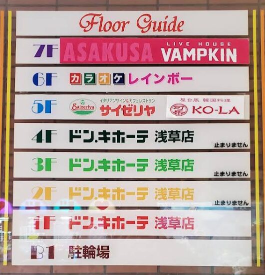 浅草ヴァンプキン(あさくさ ばんぷきん)は、東京都のつくばエクスプレス浅草駅前ドンキホーテの7階にできたライブハウスです。ドンキと同じ建物だけどエレベーターは別口、最上階で入ってすぐ エレベーター左手側に荷物はロッカーへの明示があるけど、建物内だと300円 建物1階入り口出て5秒のところに200円のロッカー有ります。フリーWiFiあり。ステージは低く、フロアは平坦です。